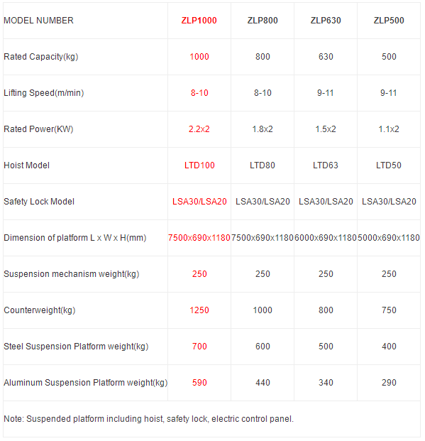 Specifications of ZLP1000 suspended platform cradle